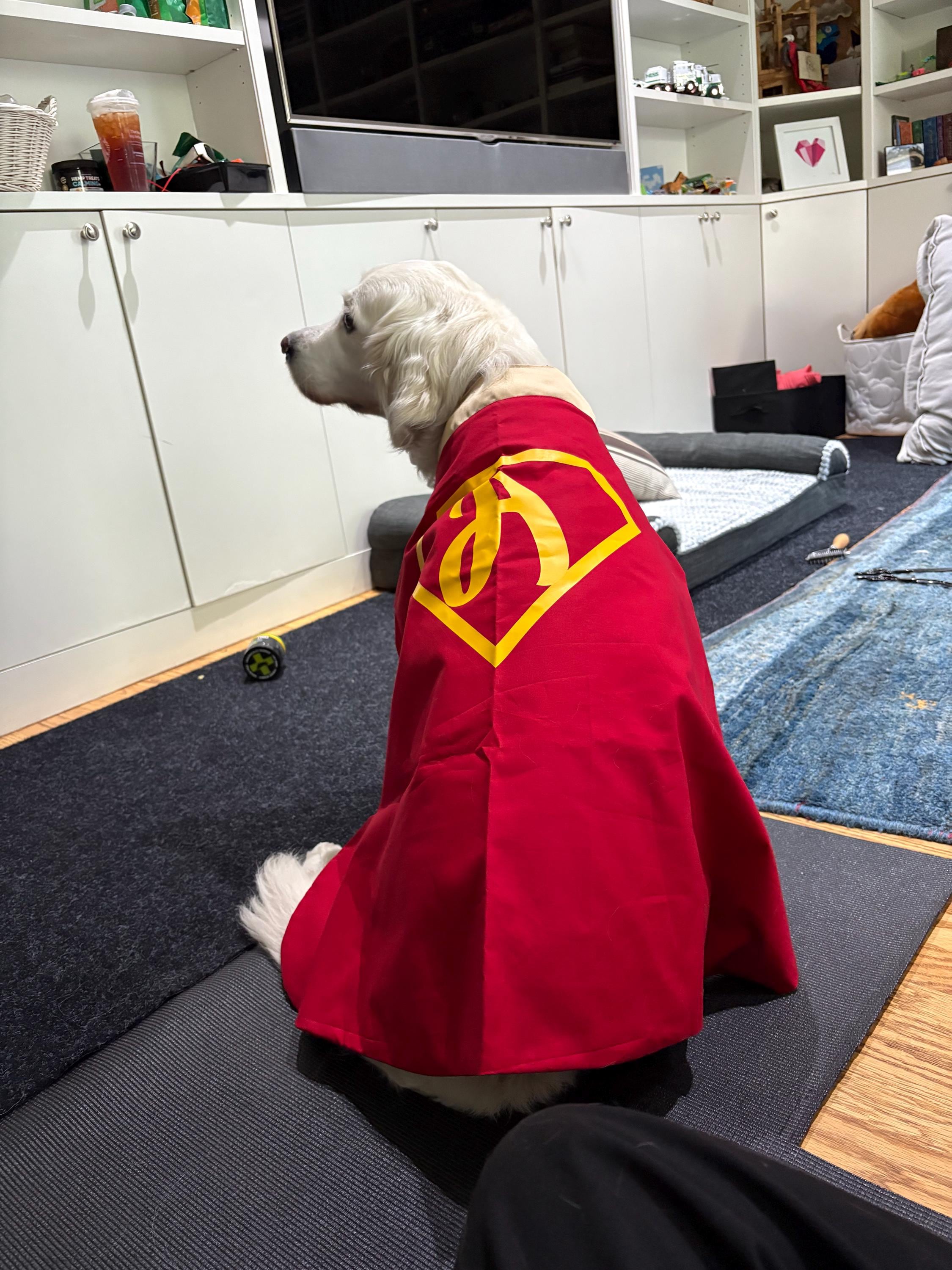 Daisy has a D on her cape. She runs faster than any cat, leaps on the couch in one jump, and can eat treats faster than you can feed them to her!