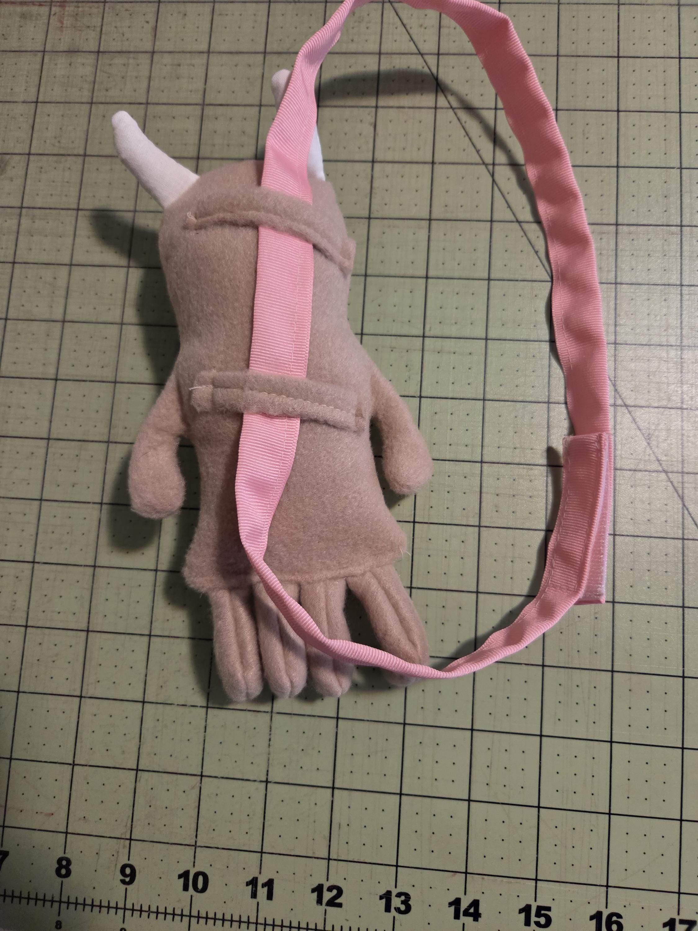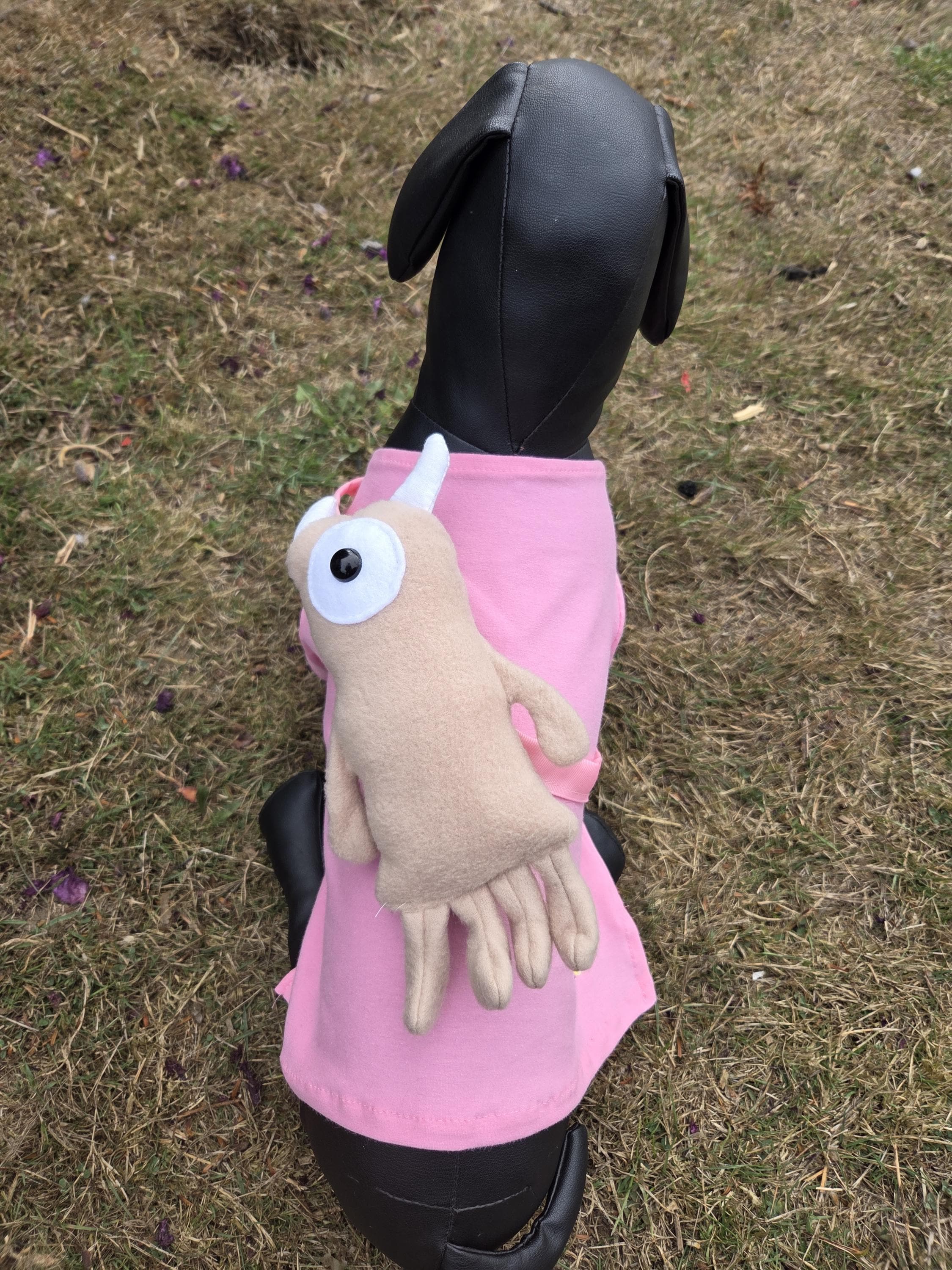 Comes with a homemade stuff monster toy, that straps on dogs back with Velcro closure.