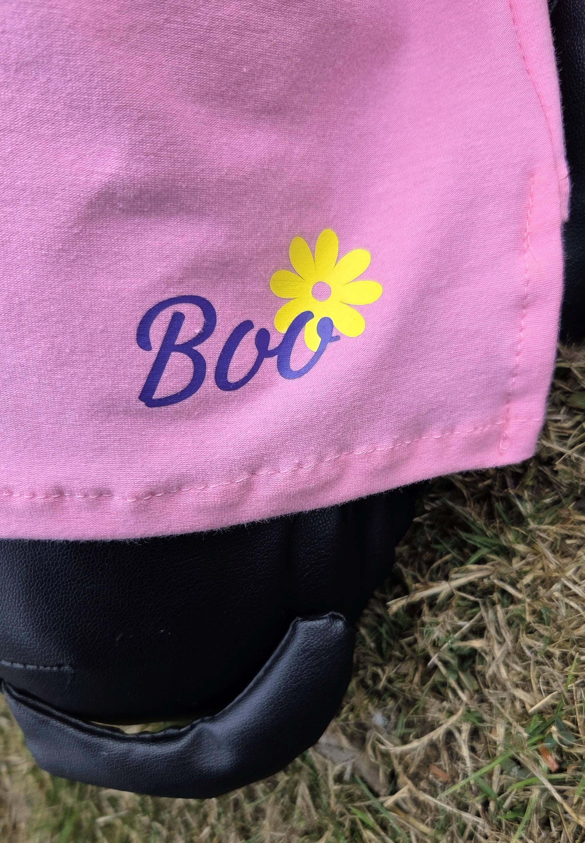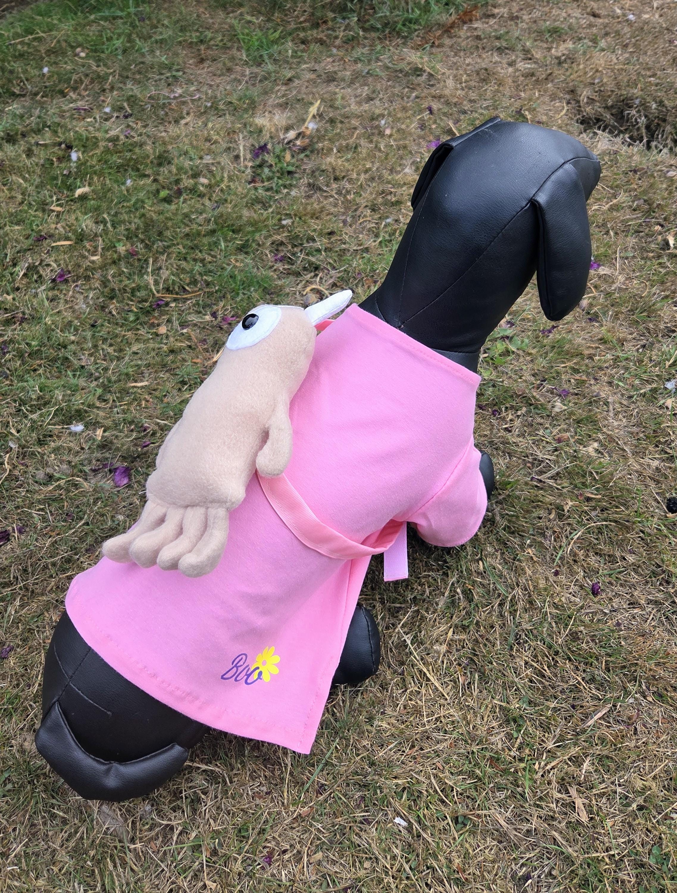 Homemade pink knit pullover dress with Boo iron on by hem.