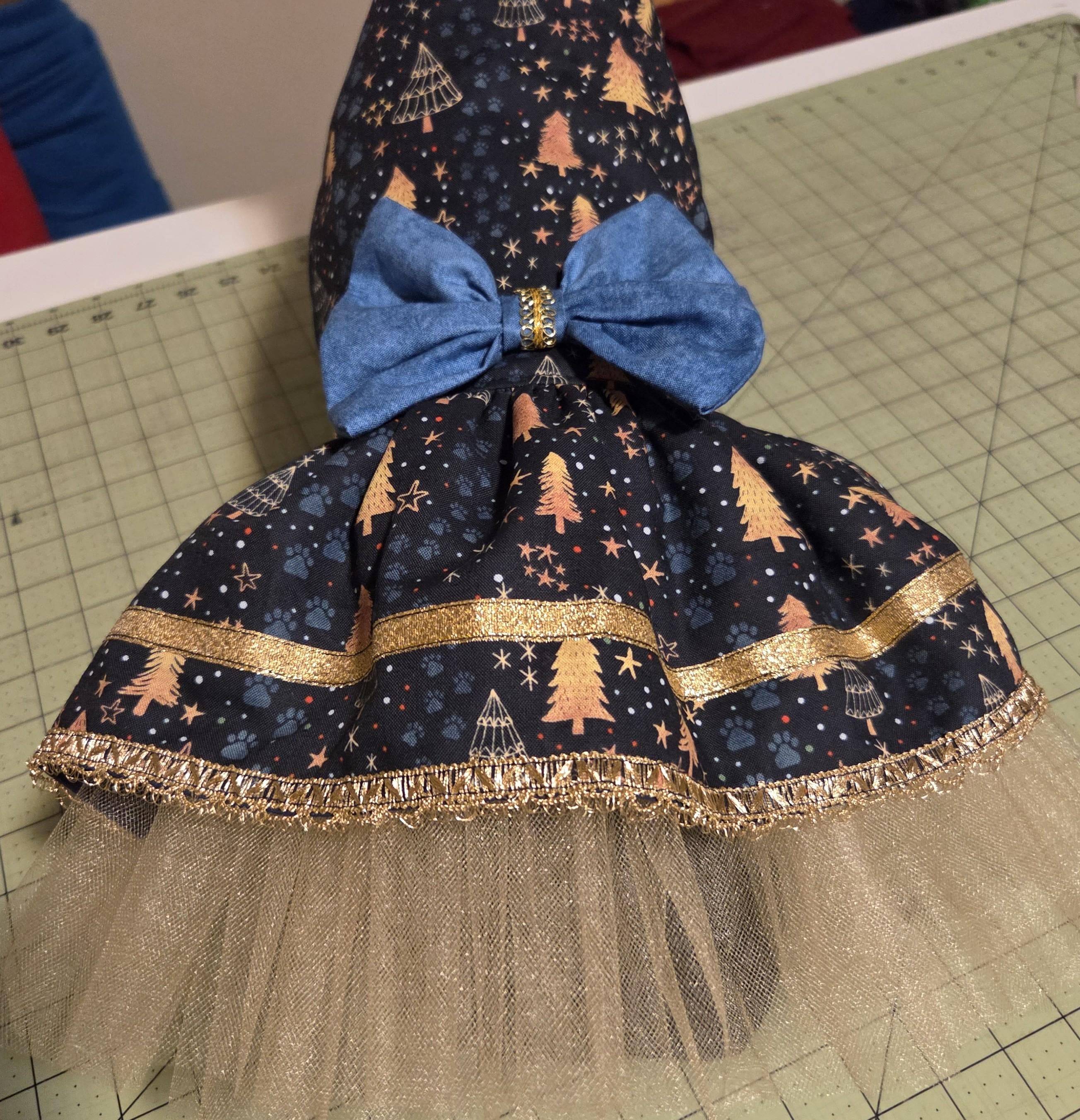 Christmas cotton dress with gold trim, gold tulle under skirt. Contrast blue bow.