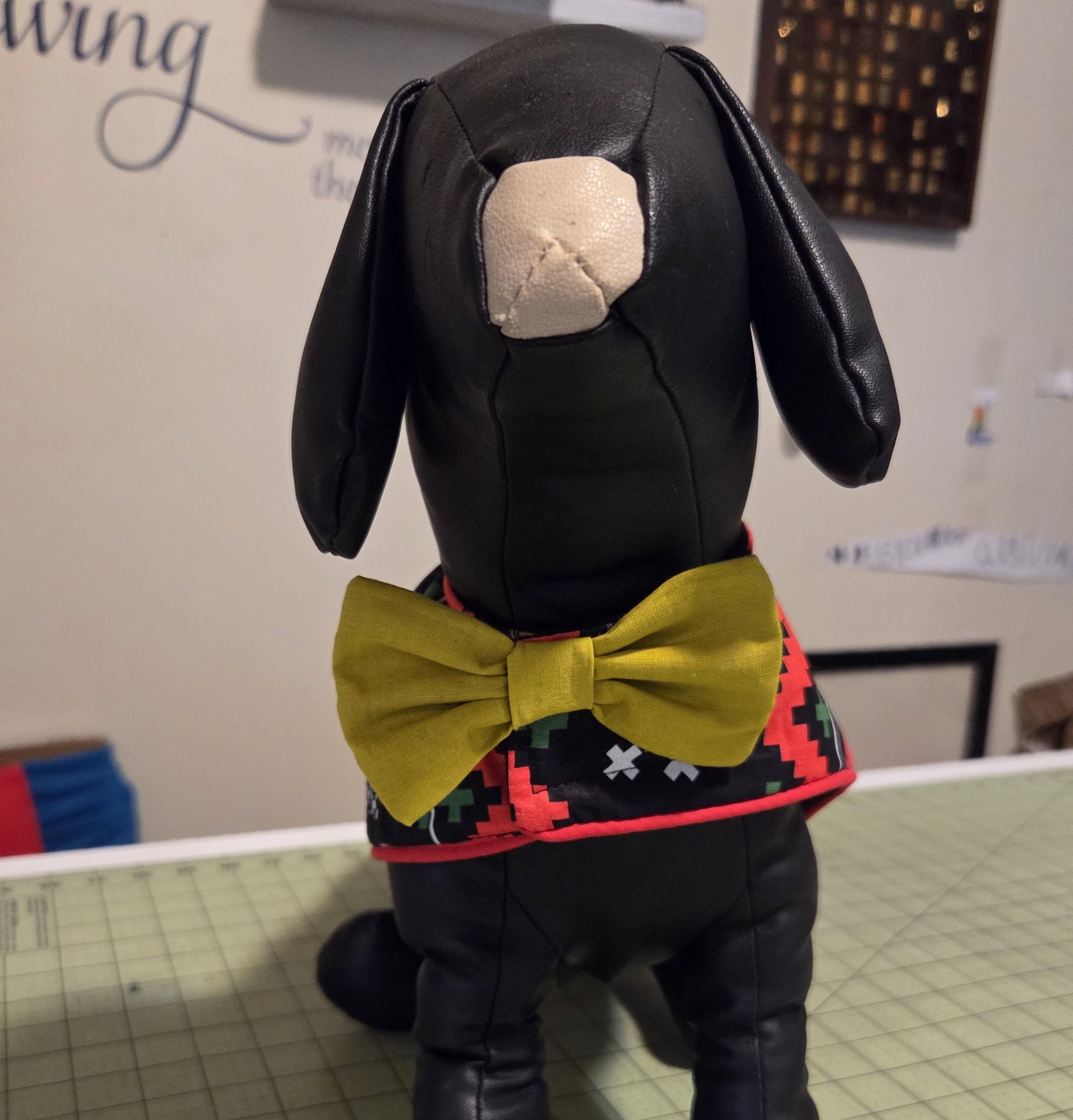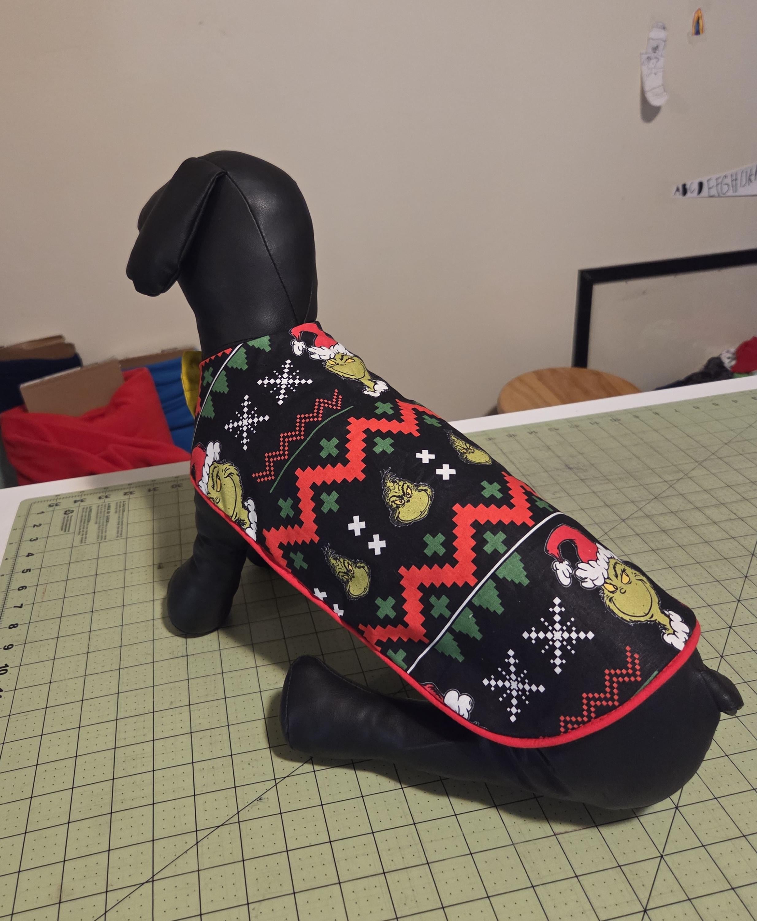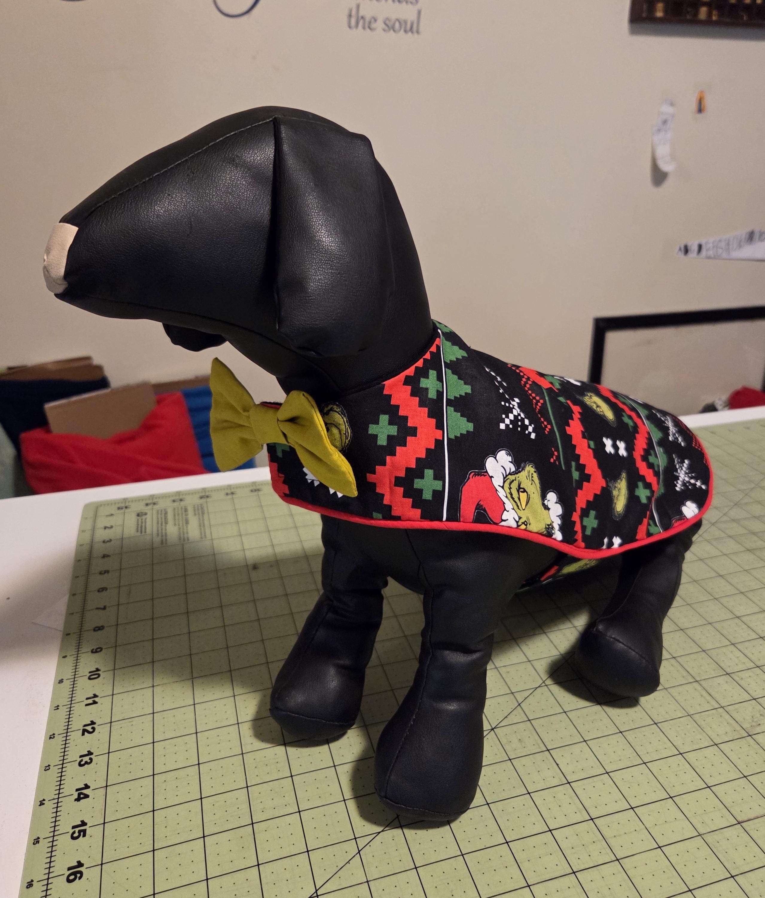 Grinch print dog jacket with red piping and a grinch green bow tie.