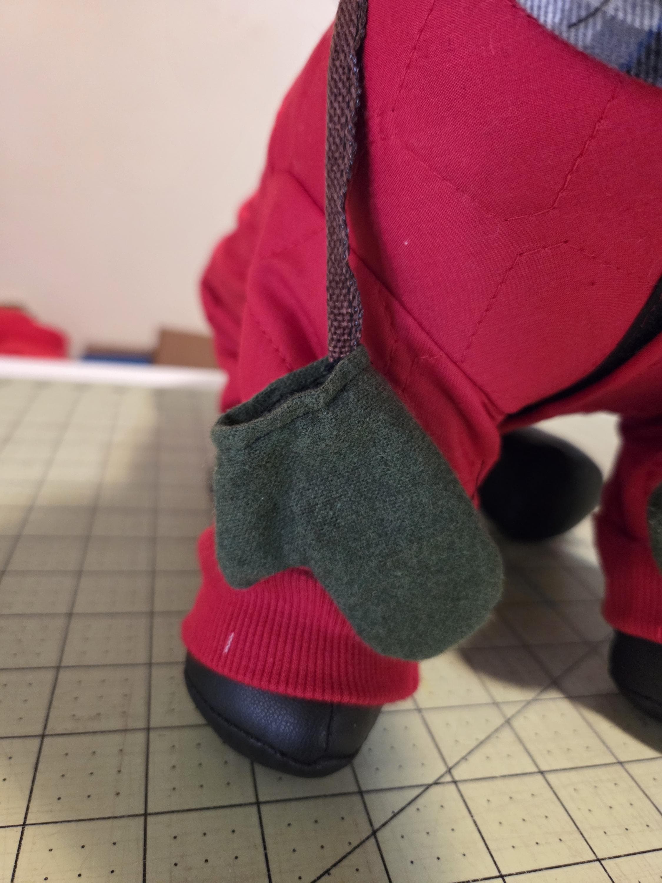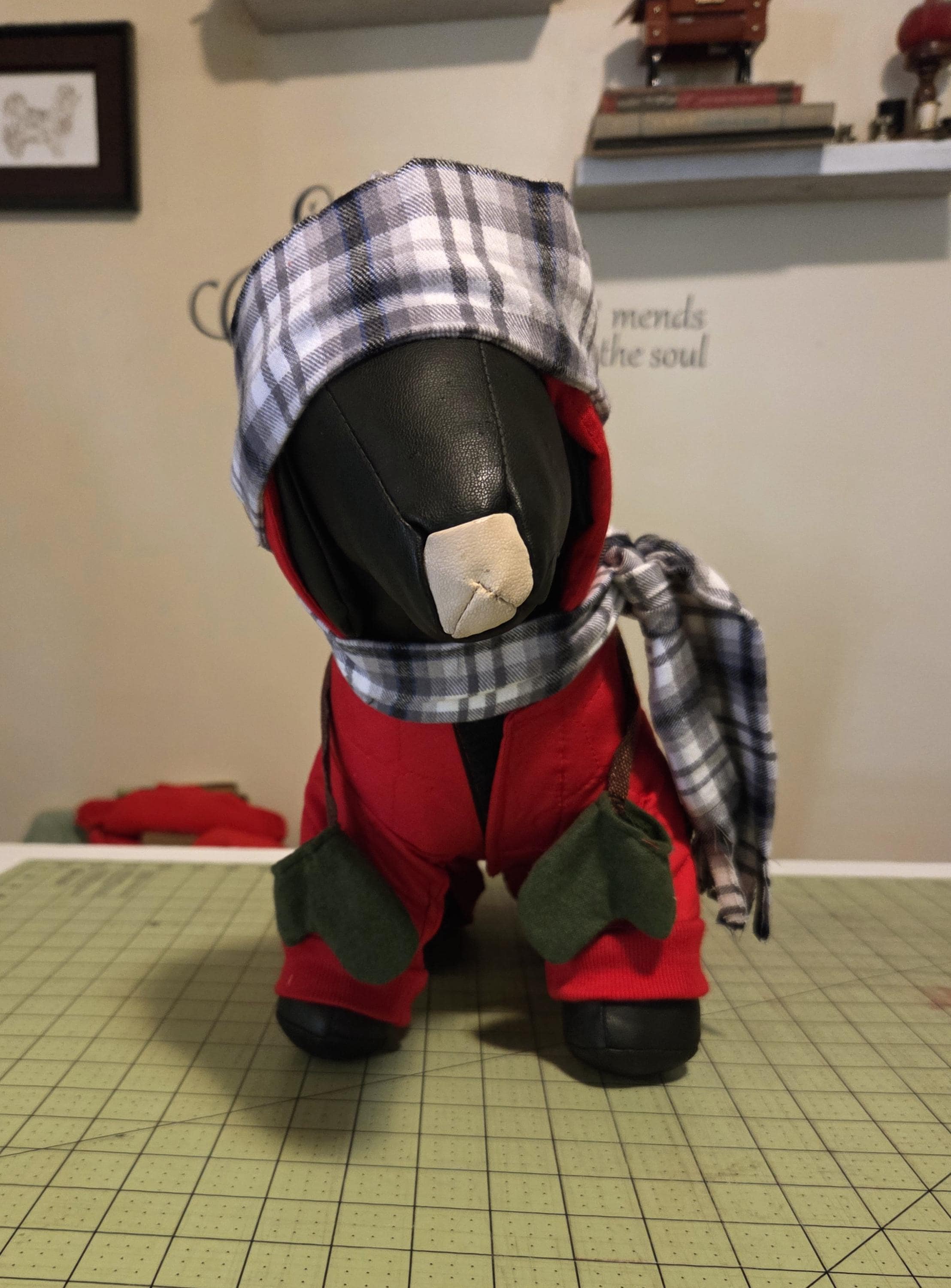Has an attached flannel scarf, that can wrap around dog's head and neck.